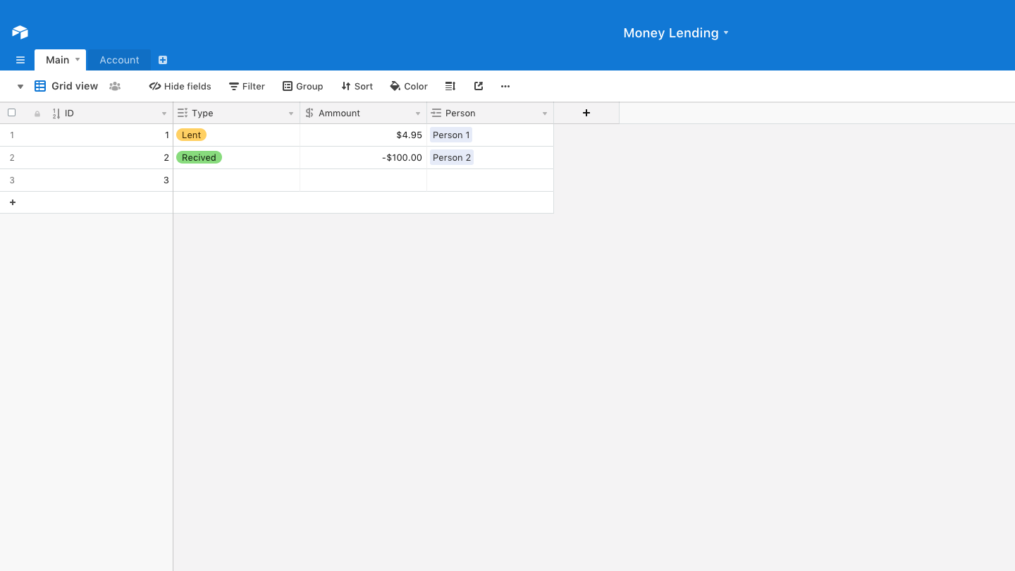 This is a simple template for keeping track of money lent to people. \Note\ This comes set up so that you have to put in a negative number in the amount section to represent money owed being given back.