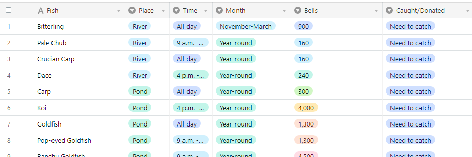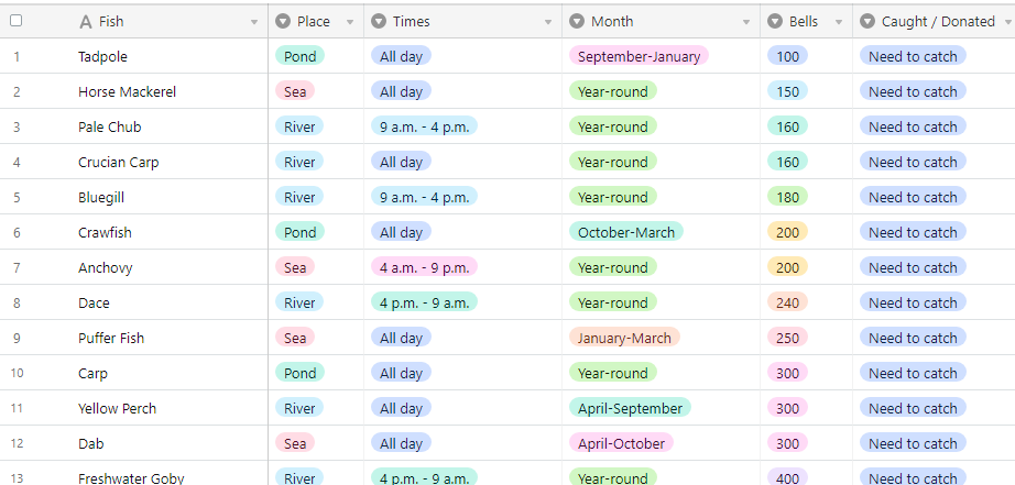 A useful table that lists all bugs,fish,fossils and nook miles to track in Animal Crossing New Horizons. - drop down of 'views' regarding statuses, only showing all/to catch/caught/donated etc - The new fossils I've found have been added - Perfect town re