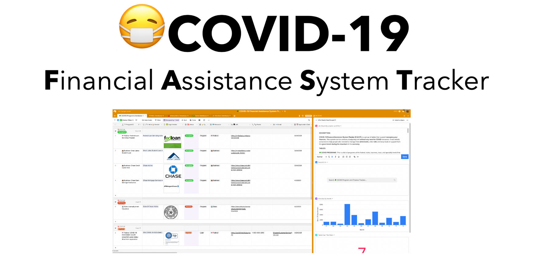 Use F.A.S.T to monitor the programs, bills, tasks and interactions with during your journey through the covid19 pandemic. COVID-19 Financial Assistance System Tracker (F.A.S.T) is a _group of tables_ that support managing your finances. This system can be