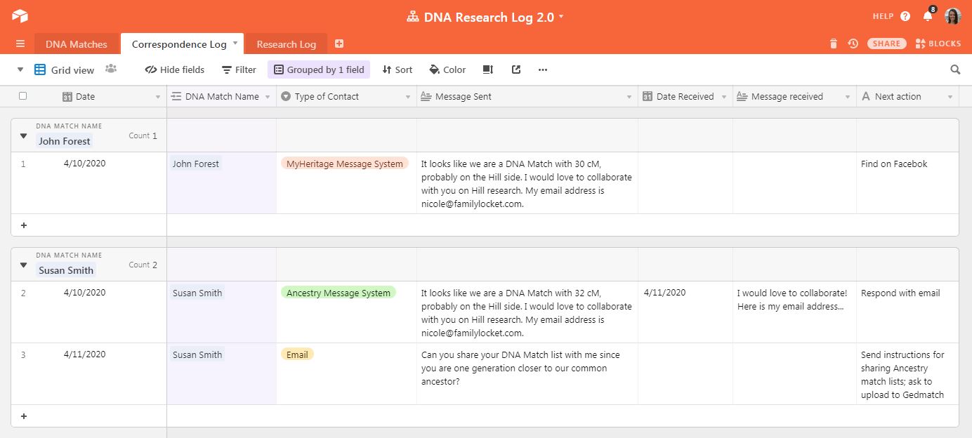 This is a base for keeping track of your DNA matches and genetic genealogy searches. Avoid duplicating data entry by keeping track of DNA matches in one table and research relating to each DNA match in the research log. Link to the name of the match in yo