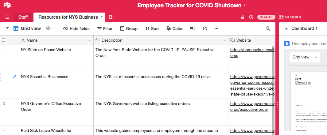 This base is designed to track a staff list as a business shuts down during the COVID Shutdown. The goal of this base is to facilitate the formal informing of temporarily off-boarding employees so that they can apply for unemployment until the company can