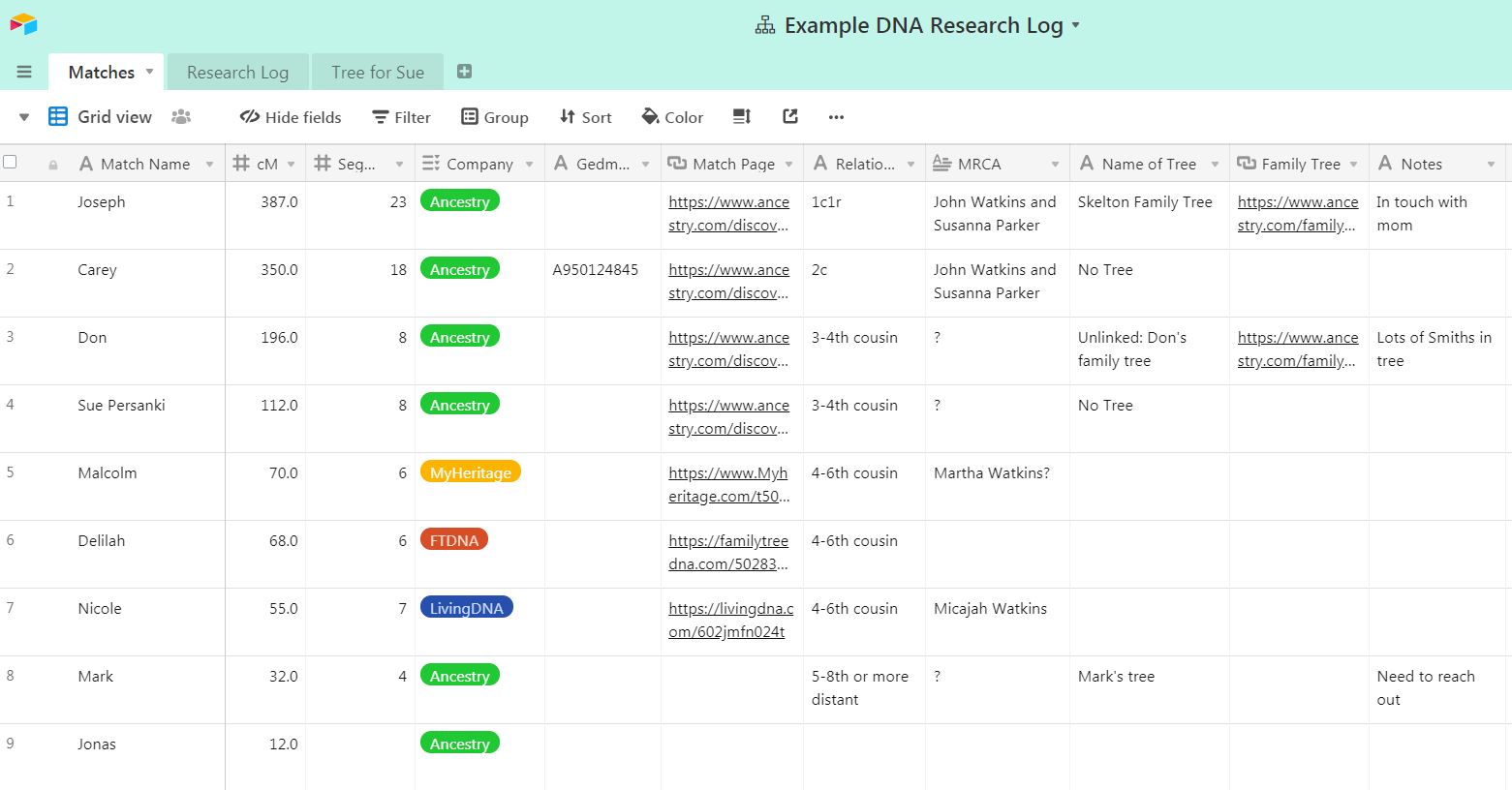 This is a base for keeping track of your DNA matches and genetic genealogy searches. Avoid duplicating data entry by keeping track of DNA matches in one table and research relating to each DNA match in the research log. Link to the name of the match in your research log so you know which DNA match you are researching.
