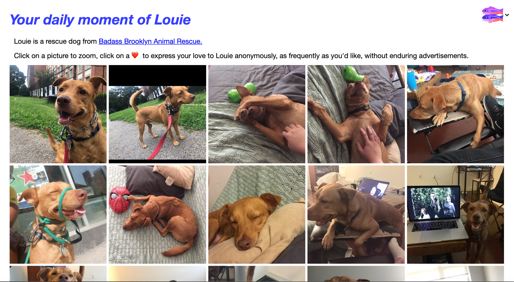 Make your own free photo sharing site where people can anonymously <3 a picture as many times as they'd like! For an example checkout louie.glitch.me Steps: - remix this glitch project [https://glitch.com/~louie](https://glitch.com/~louie) - make your own version of this airtable template - replace the api keys - have a lovely photo sharing site to send to friends that you can update on your phone!